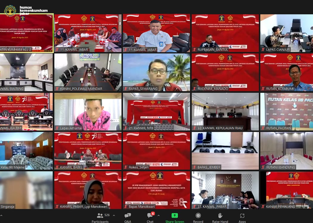 BIGNEWS.ID – Pejabat Struktural, Staff keuangan, dan jajaran Staff Lapas Kelas IIB Majalengka mengikuti Acara Penyerahan Laporan Hasil Pemeriksaan (LHP) BPK-RI Atas Laporan Keuangan Kementerian Hukum dan HAM Tahun 2022 secara Virtual melalui Aplikasi Zoom langsung dari Kementerian Hukum dan HAM RI, Jum’at (04/08/2023).